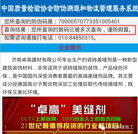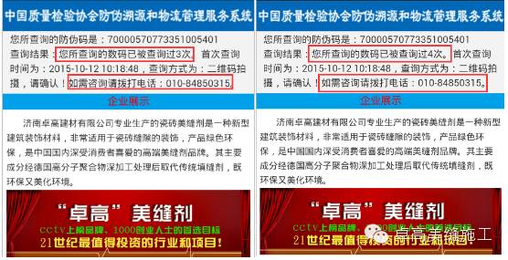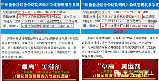 當(dāng)廣大消費(fèi)者掃描以后出現(xiàn)第五次掃描的現(xiàn)象時(shí),請大家及時(shí)聯(lián)系中國質(zhì)量檢測協(xié)會(huì)或者濟(jì)南卓高建材有限公司。